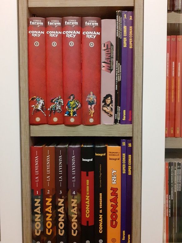 He estado reordenando mis baldas, una vez que Planeta ha terminado de publicar sus integrales, y pensé en dedicar dos baldas pequeñas a dichos tomos, añadiendo los super conan, tanto en el lateral como en el fondo, mas las novelas gráficas de Forum para rellenar.