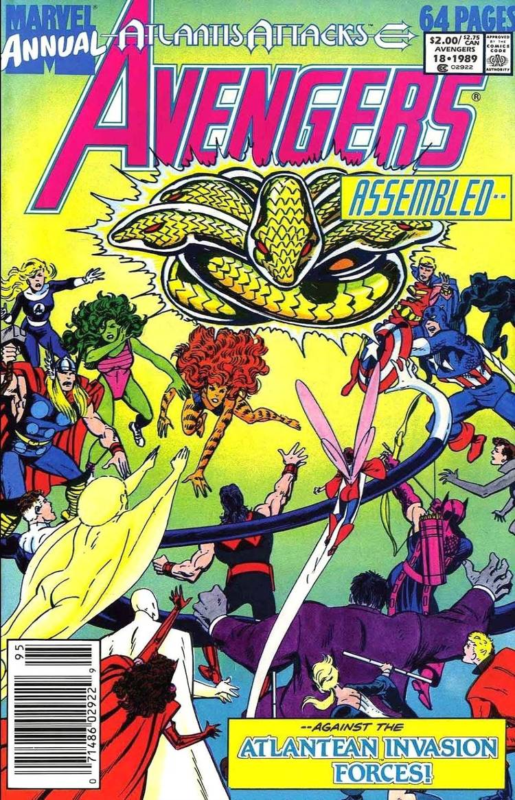 Bien, pese al retraso, aquí estamos, para reseñar un poquito el evento de Atlantis Ataca, que afectó a 14 Anuales de la plana mayor de la Casa de las Ideas, y que narra las malandanzas de Ghaur, un villano que pretende traer a Set a la dimensión terrícola 616 para que domine el mundo y todo eso. Entre esos Anuales están, obviamente, dos que nos interesan en este club: el de Vengadores y el de Vengadores Costa Oeste. Leyendo solo estos dos Anuales no nos enteraremos de nada, pues son trozos sueltos del crossover. Y a mí al menos me gusta hacer las cosas bien o para eso no las hago, de modo que decidí meterme entre pecho y espalda el crossover enterito que, dicho sea de paso, me he enterado de que salió en un Marvel Limited Edition. Yo he leído el orden sugerido por la app de Marvel Unlimited y voy que chuto, aunuqe confieso que de ver el MLE barato -algo improbable- lo compraría por puro nocillerismo.