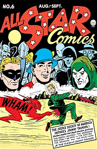 No quiero contar mucho de la historia, porque seguro que los interesados en este decano grupo os pondréis a leerlo en un momento u otro, y además el número tampoco tiene demasiado: Flash (Jay Garrick, claro) es nombrado miembro honorario y pasa a formar parte de la reserva del grupo, como Superman y Batman (a.k.a. su serie iba como un tiro, pun intended, y no necesitaba compartir páginas con los demás personajes del grupo, ya no necesitaba promoción). Lógicamente quedará una vacante y Johnny Thunder intentará ganarse el respeto de los demás atrapando un maloso. Lo que no sabe es que la JSA es una panda de cabrones que le asignan esa misión para reírse de él, porque tal maloso no es más que un chiste, o eso se piensan
