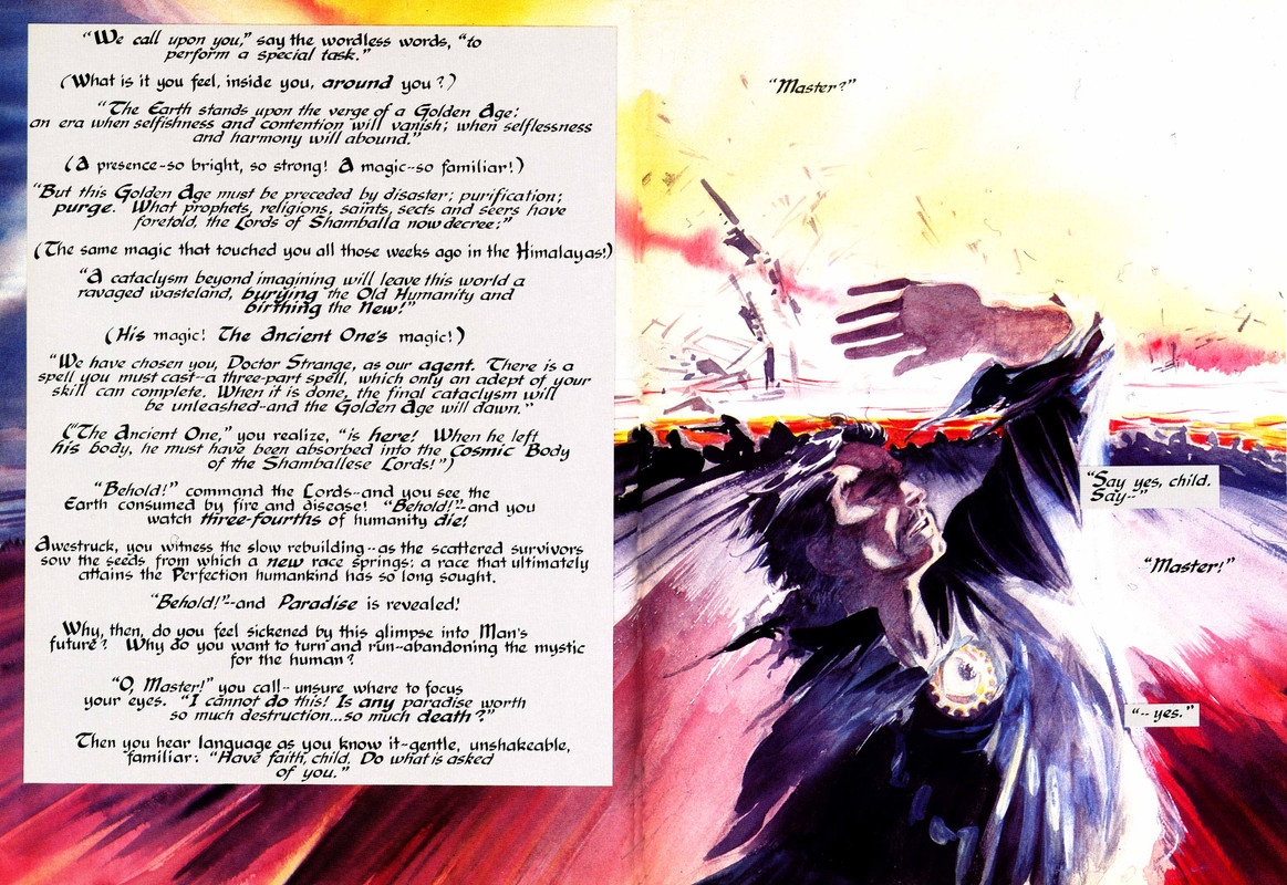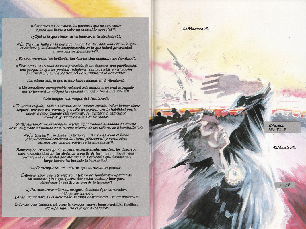 Una cosilla sobre la nueva edición de SD (64 páginas a 16 pavazos, y sin intro ni nada) de la novela gráfica "Doctor Extraño: Dentro de Shamballa". En cierto otro foro de confianza, en su día vi un escaneo (de hace muchos años, además) de la anterior edición de Panini y, al compararlo con el escaneo de la nueva edición de SD, al parecer esta última tiene unos colores más apagados. De hecho, si revisamos la versión original digital, veremos que ese antiguo escaneo es el que más se asemeja a esos colores. Dejo aquí un ejemplo (respectivamente anterior edición, nueva edición y original digital):